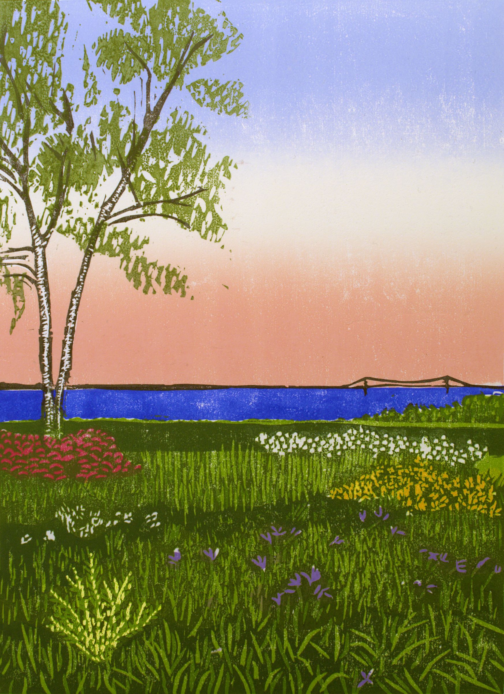 Many of the homes on Mackinac Island have gorgeous gardens that contribute to the magic of being in that enchanting place! Add to that a view such as those along the western bluffs, overlooking the Straits of Mackinac and Mackinac Bridge. This woodcut suggests just a bit of that inspriation....
