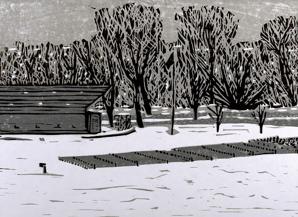 My series of three "Sand River Bay" woodcuts were entered into the Bonifas exhibition "Northern Exposure XVIII" and won an award for me as Artist in Residence for a week at the Bonifas Arts Center in Escanaba. In March this year I stayed at Bayside BnB and focused on creating simple, mostly one color, woodcuts each day. I taught a workshop and hosted many visitors who stopped by my studio to see what I was doing.