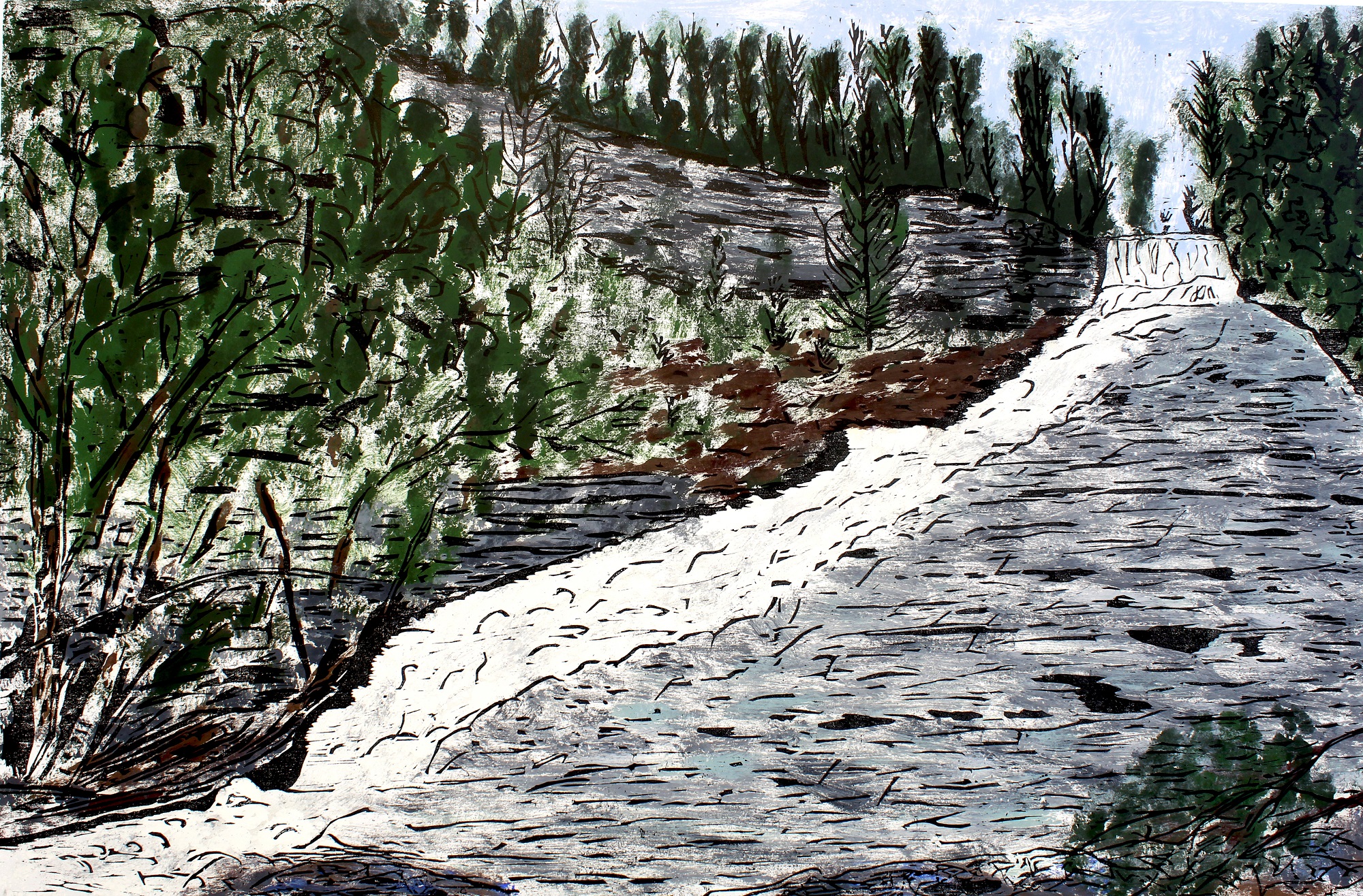 This and "Sturgeon River Rapids" are the first of a kind for me, combining a Monotype with a Woodcut. They are the largest of anything I have done, 22 by 34 inches. After drawing and sealing the image on the woodblock I painted it with my printmaking ink and pressed the paper to it, creating the colors of the print. I did this four times for four prints, each uniquely different. Then I carved the woodblock and printed that in block over the top of each monotype.