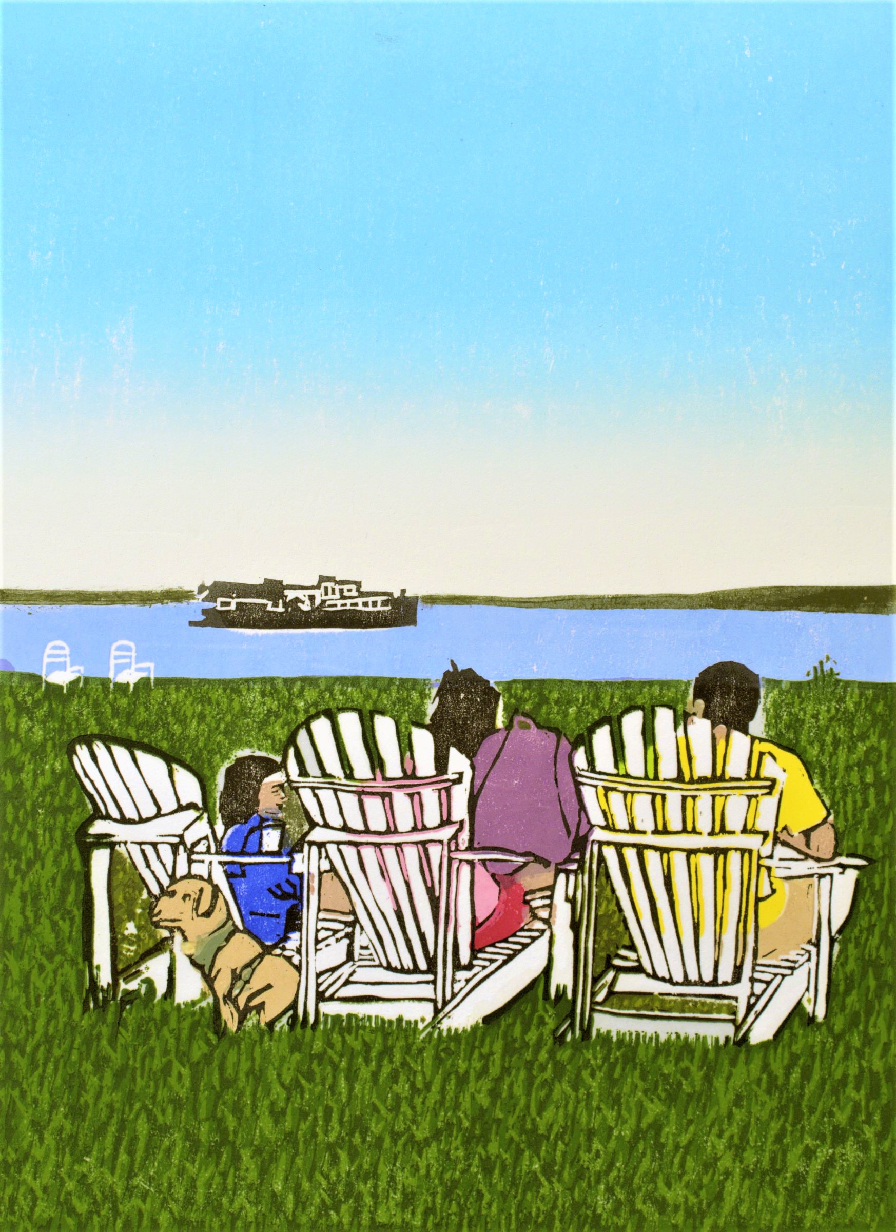 Adirondack Chairs have become a symbol of relaxing on Mackinac Island at many of the hotels, especially at Misson Point Resort where they are available to all island visitors. That's one of the biggest reasons the Island is so popular, a place to get away from daily life and take a welcome break. This woodcut invites you to bring your family, even your dog, and maybe take a short cruise around the Island, too.