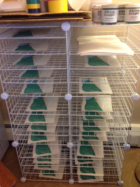 Many copies are made of each image and dried on my rack, before the next image and color is added.