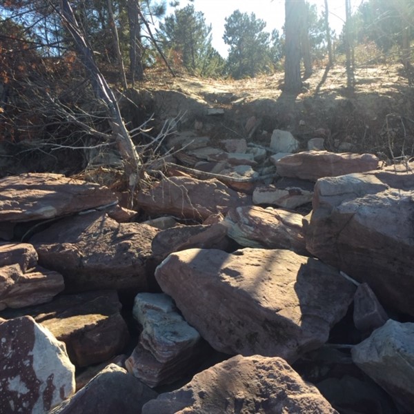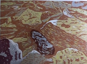 Walking along the beach near our house I was fascinated by the rocks, their contours, textures and colors. Knowing it would make an interesting print, I took some photos. Back to my computer I cropped and reversed the image in my photo editor, and then "posterized" it in order to simplify the color scheme.