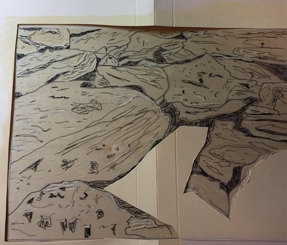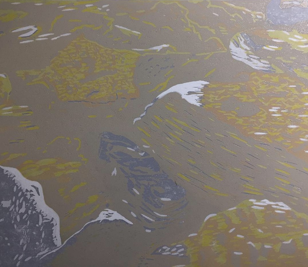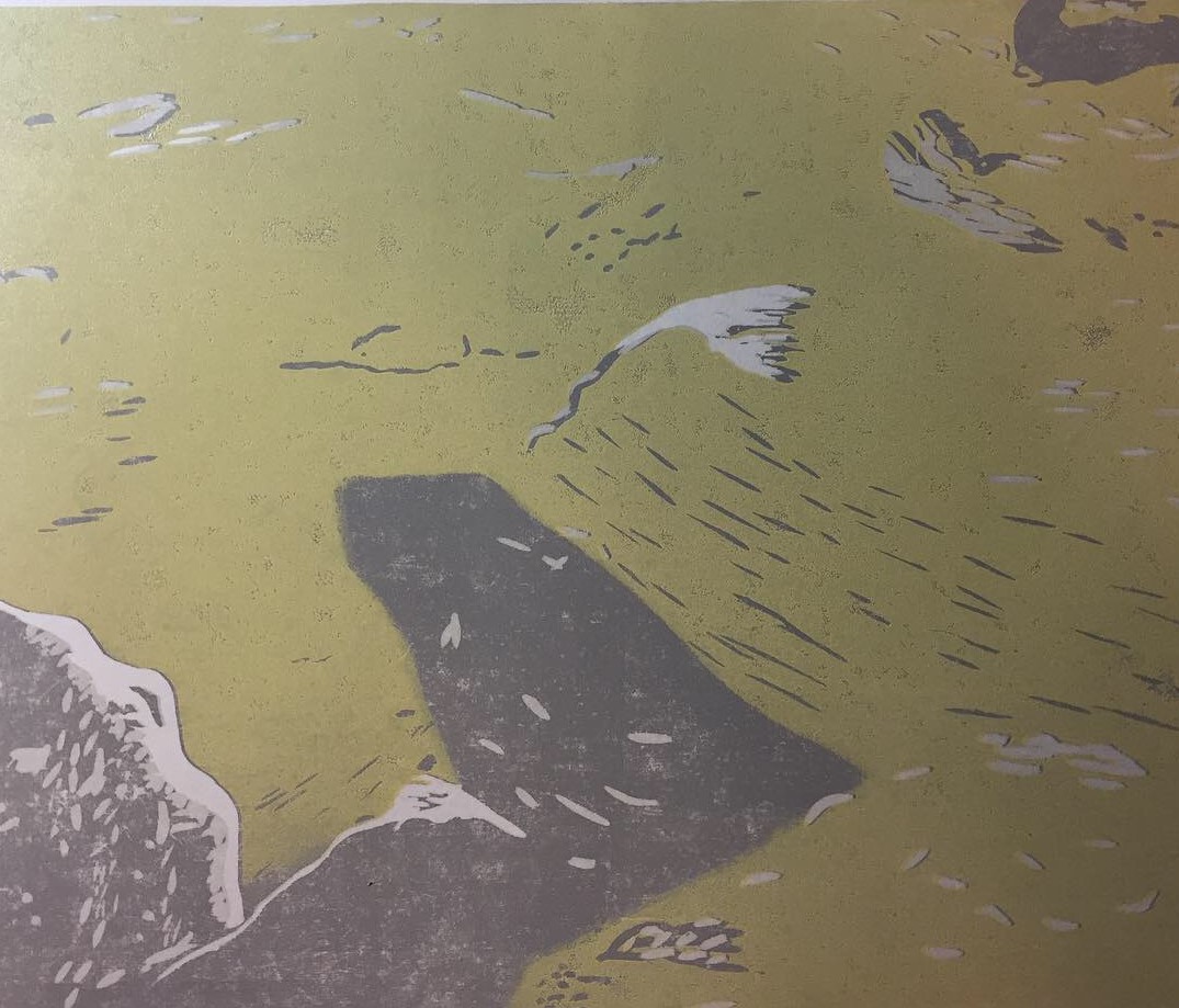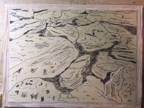 And now - It's almost done. I just need to add the black. See the completed woodcut called "Rocks Along the Shore."